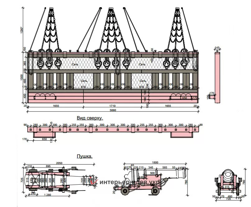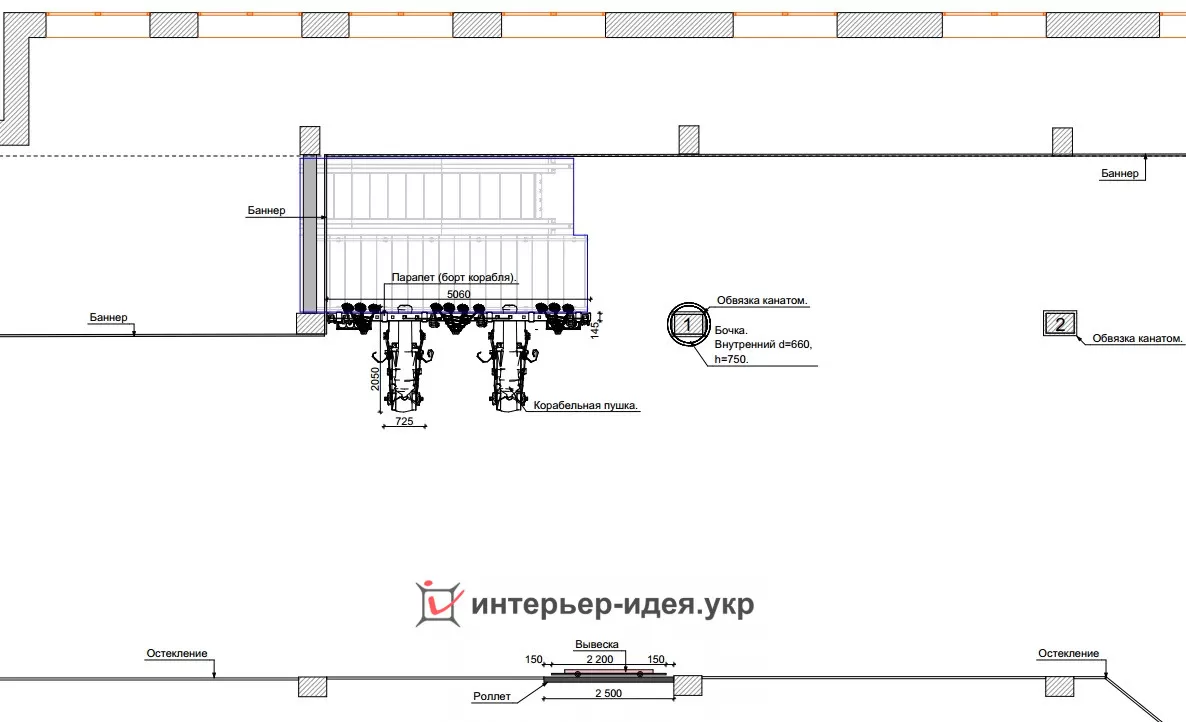 Щоб приховати нерівності стелі, поєднати світильники і максимально підтримати корабельну тематику, ми всі елементи стелі з'єднали обв'язкою канатів.