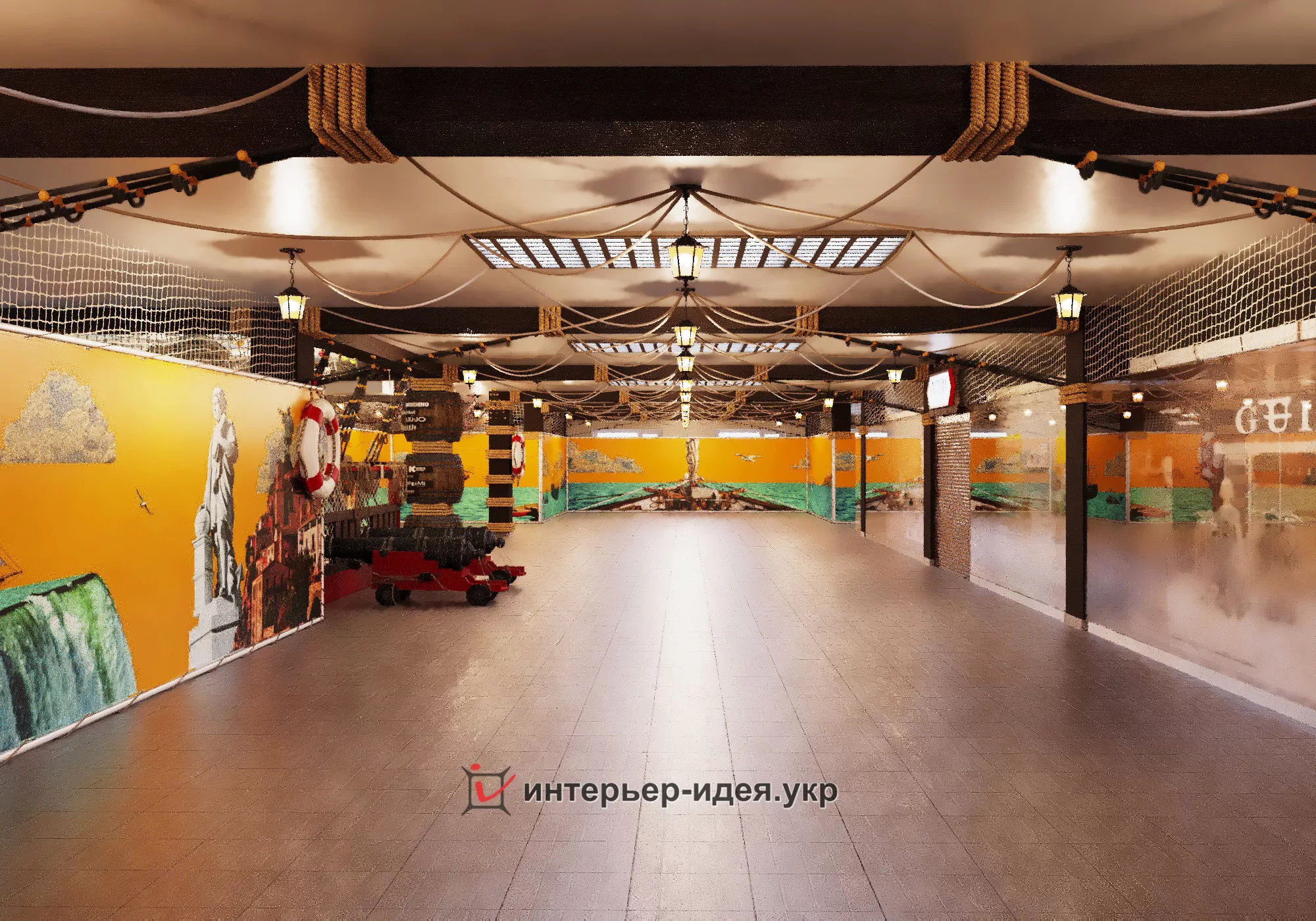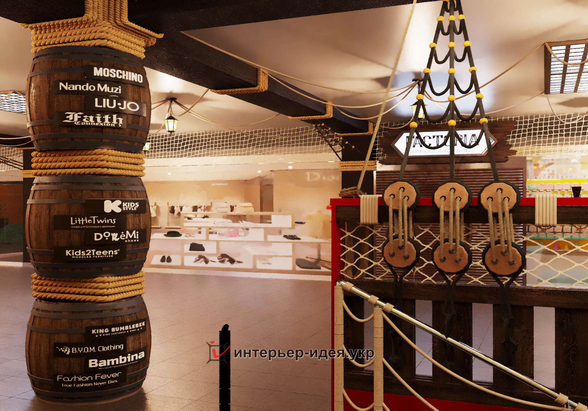 Елементи декору – бочки, сітки, канати, гамаки та інша морська атрибутика.