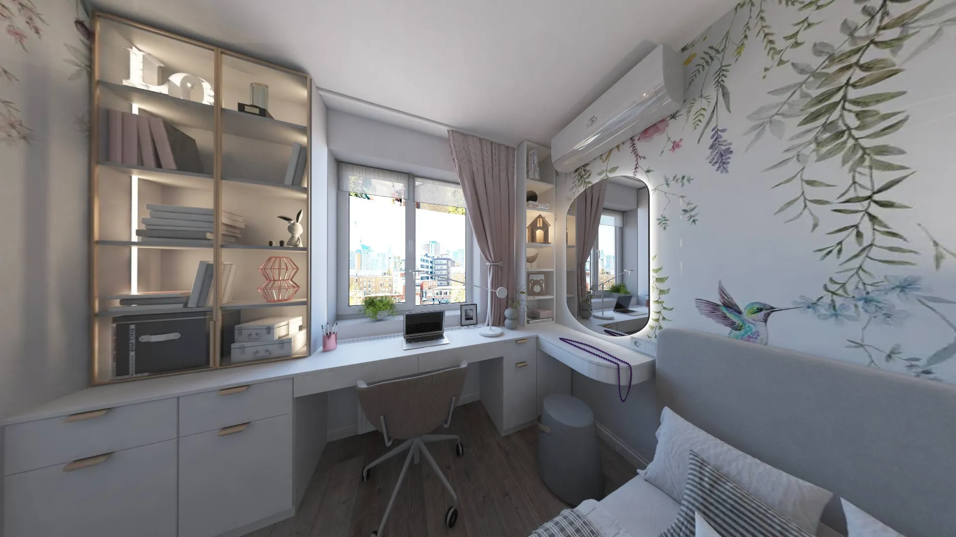 Основним відтінком вибрано білий, який розширює простір і наповнює його світлом. Акцентом стали шпалери з квітами та птахами – вони вносять в інтер'єр делікатні фарби та створюють настрій легкості.