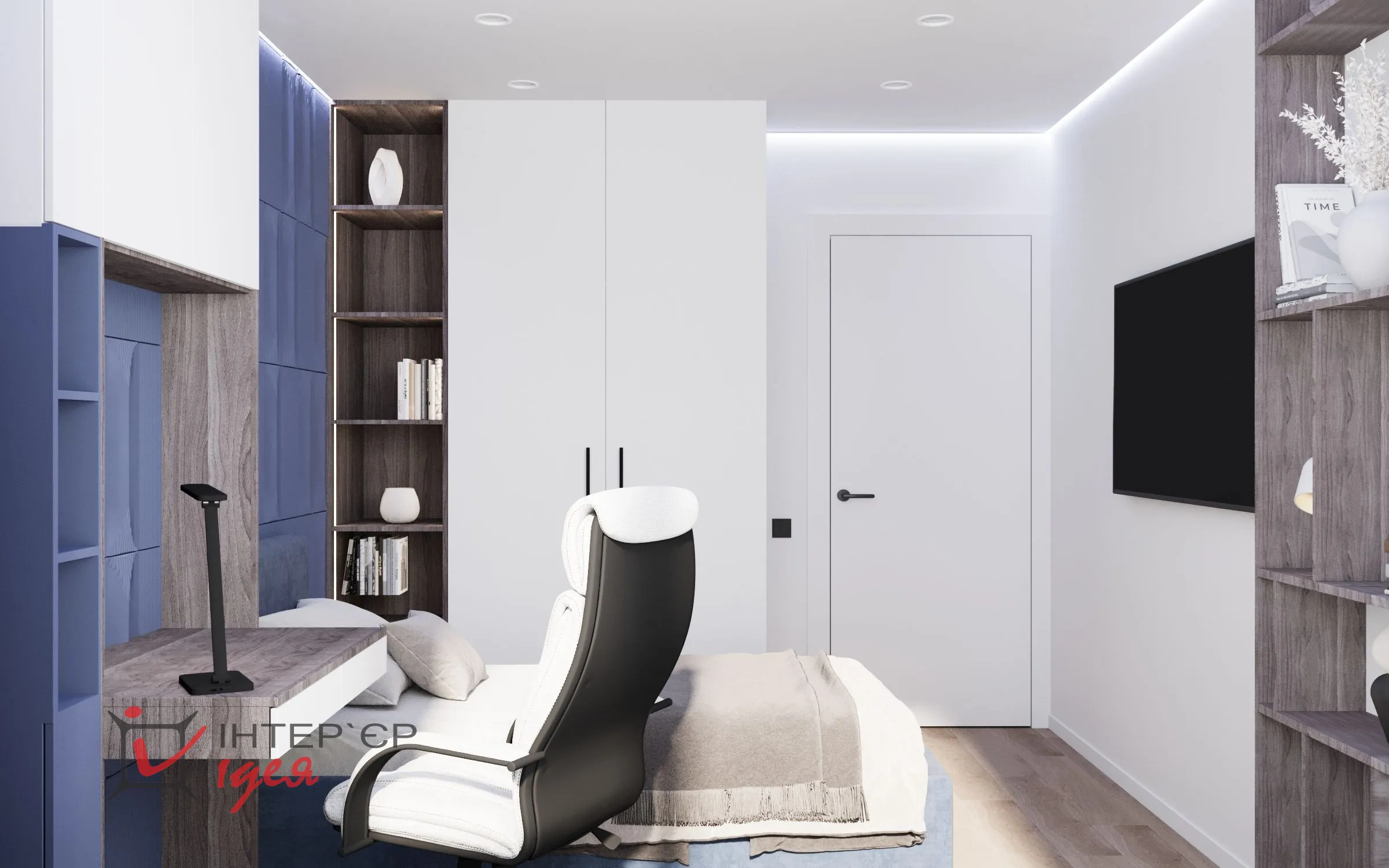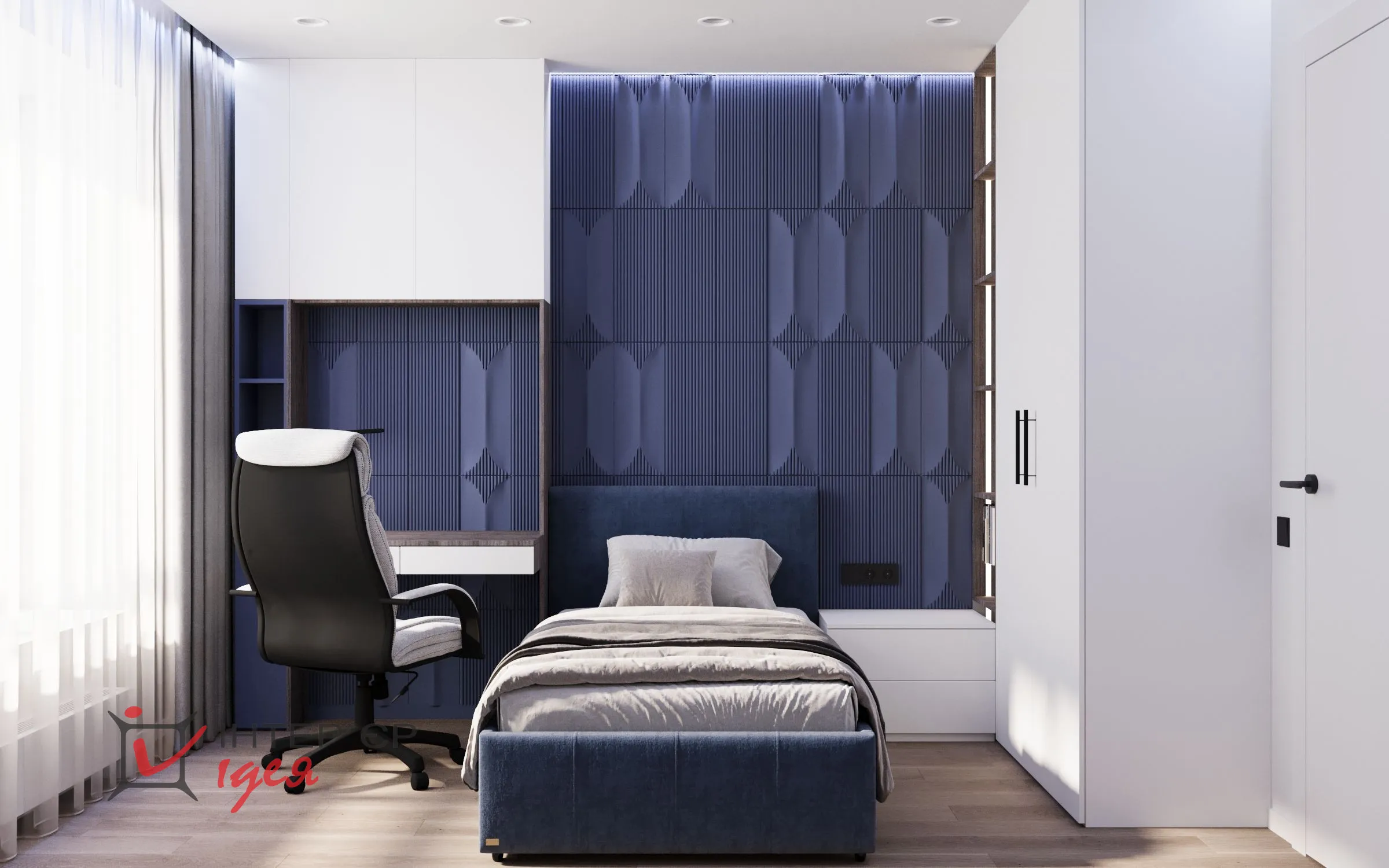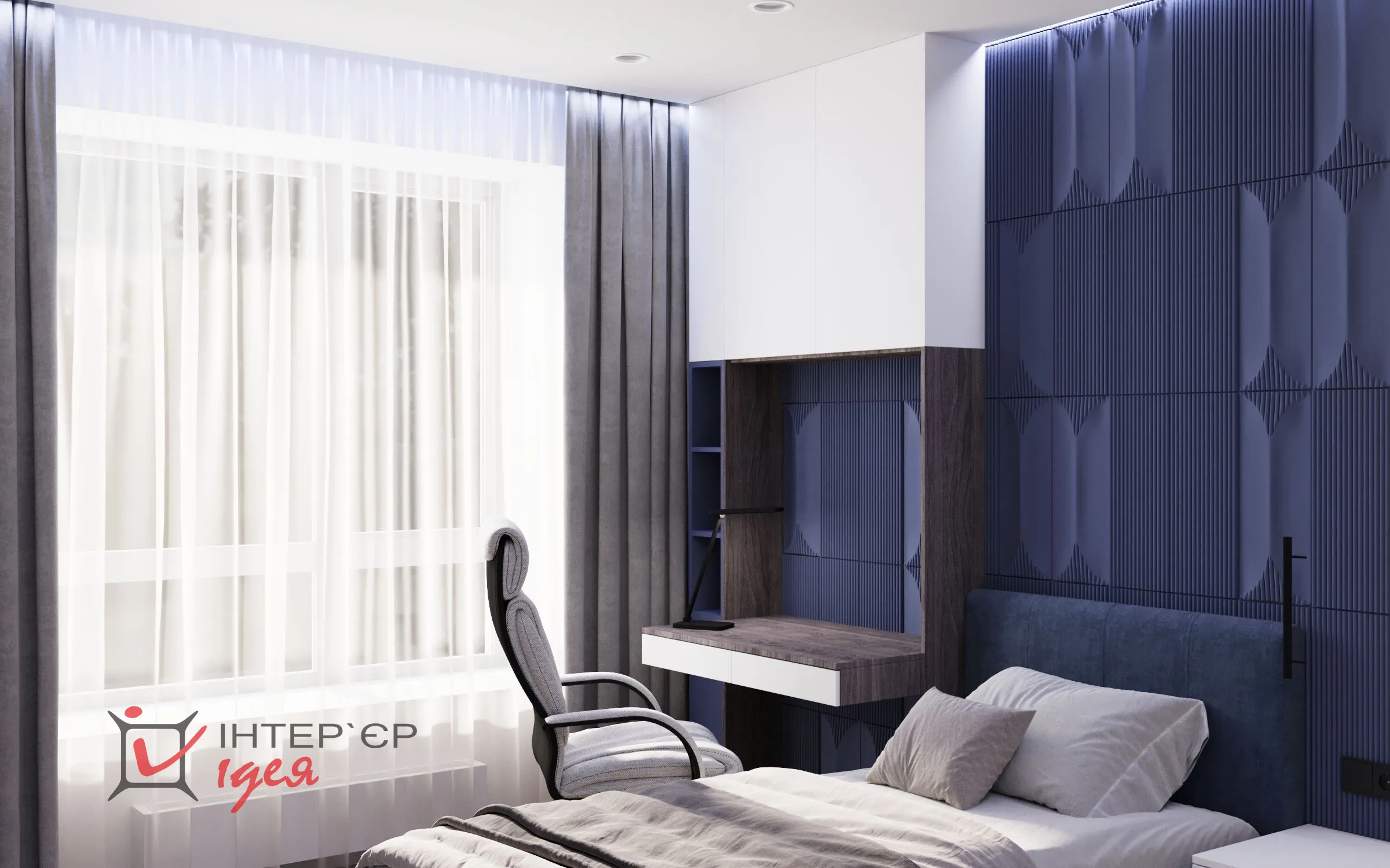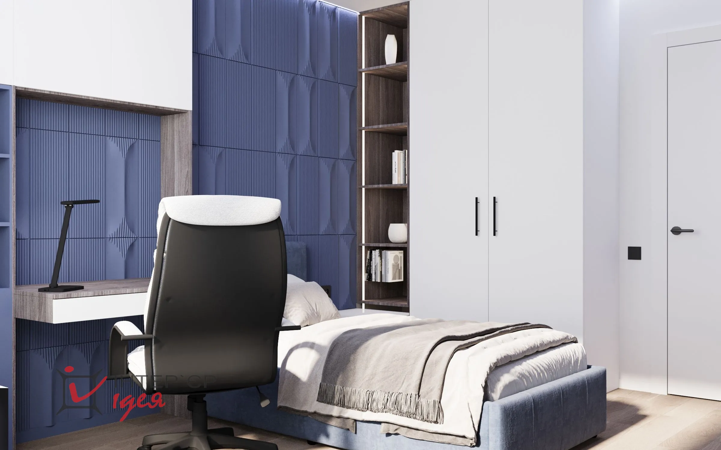 Цей інтер’єр створено для школяра, тож головним завданням було поєднати функціональність, комфорт і характер. Основний акцент у кімнаті — глибока синя гіпсова панель на стіні, яка додає простору ритму й виразності.