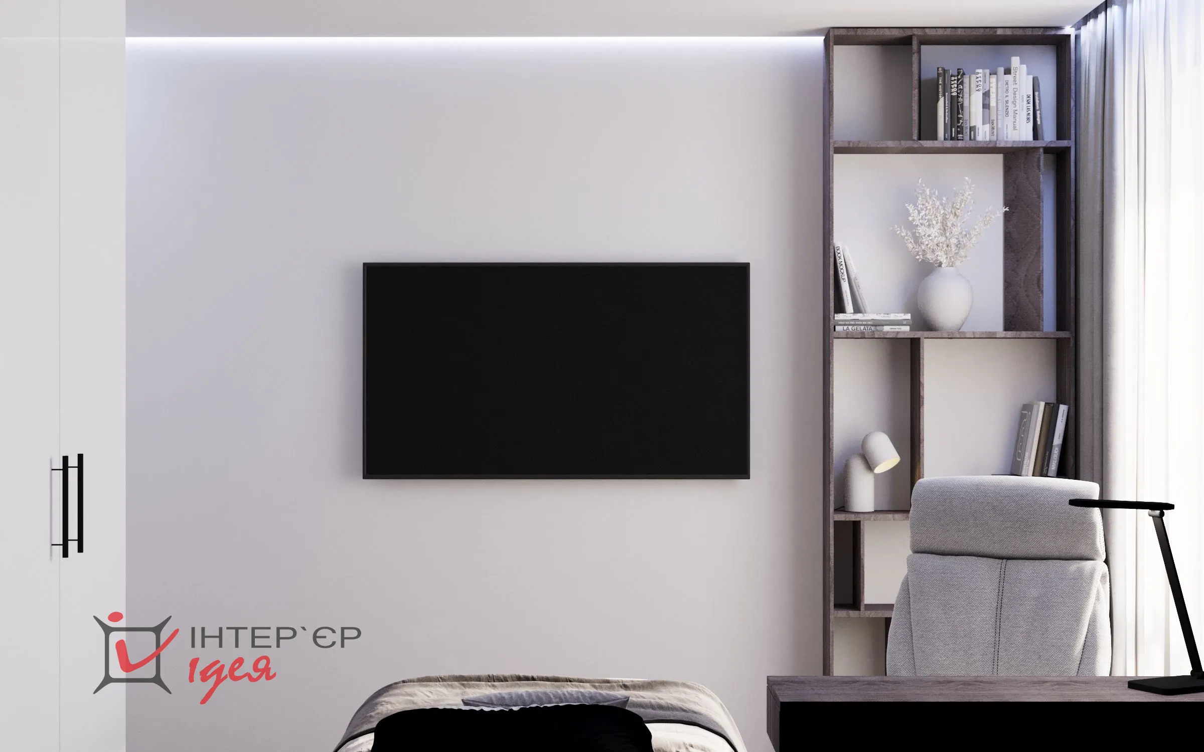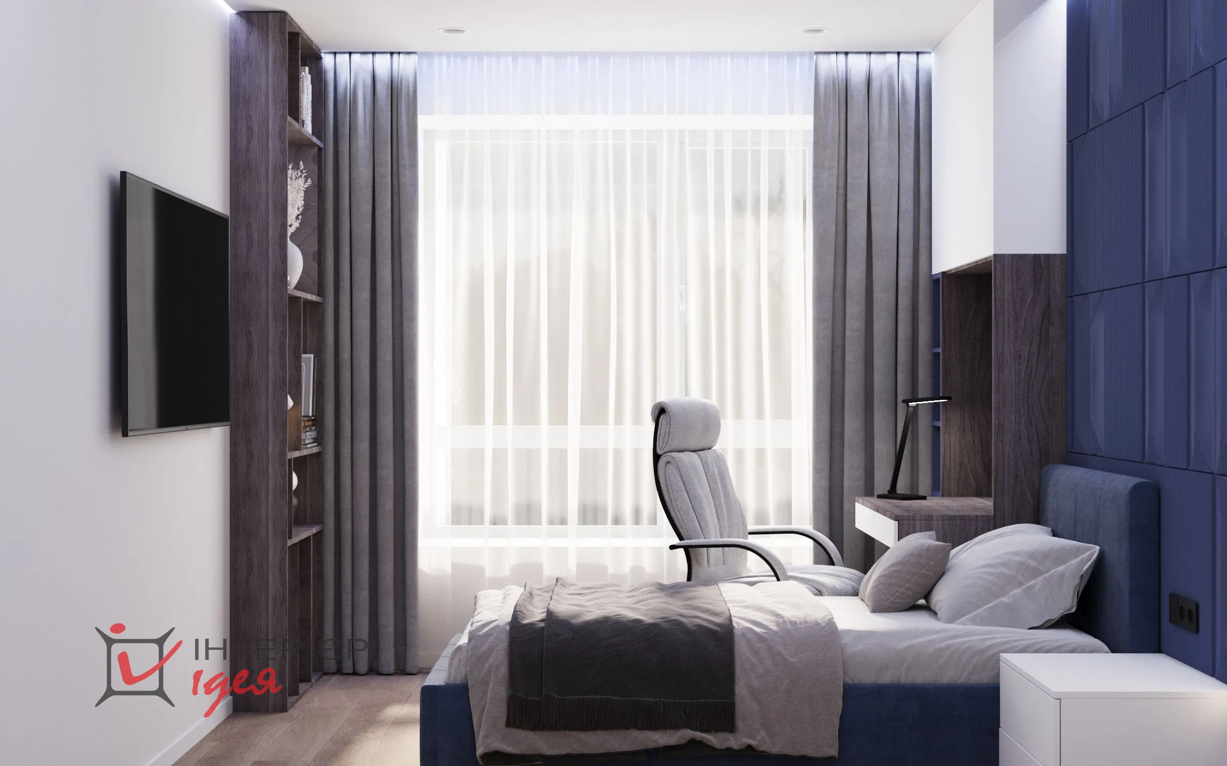 Телевізор, вбудовані полиці для книг і декору, а також велике вікно з щільними шторами й тюлем роблять простір комфортним і для навчання, і для відпочинку. Тут кожен елемент має свою функцію, але не перевантажує загальну атмосферу.