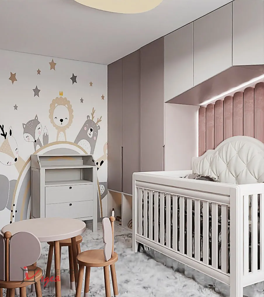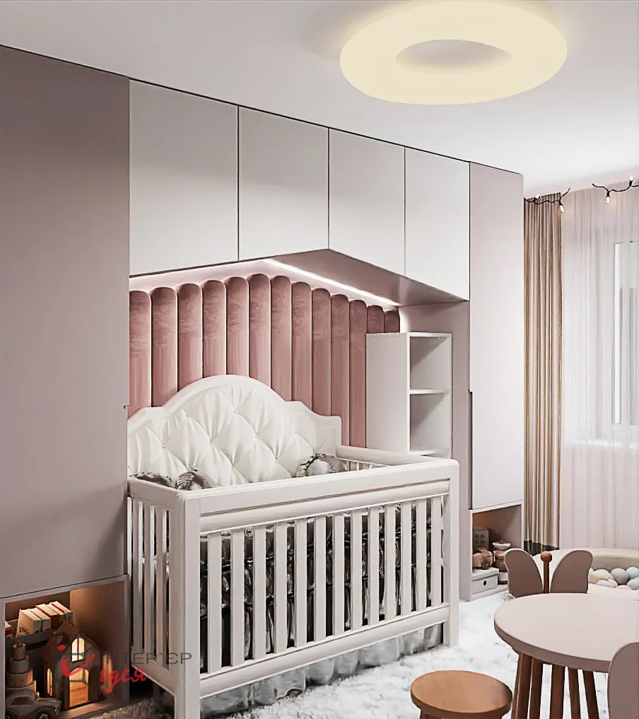 В пропозиції враховувались вікові зміни, адже з часом частина меблів залишиться, а дитяче ліжечко, пелинальний комод заміняться на більші меблі, добавиться робочий стіл для навчання. Надіємся, що коли дівчинка виросте, вона вподобає практичність та естетичні рішення в її кімнаті.