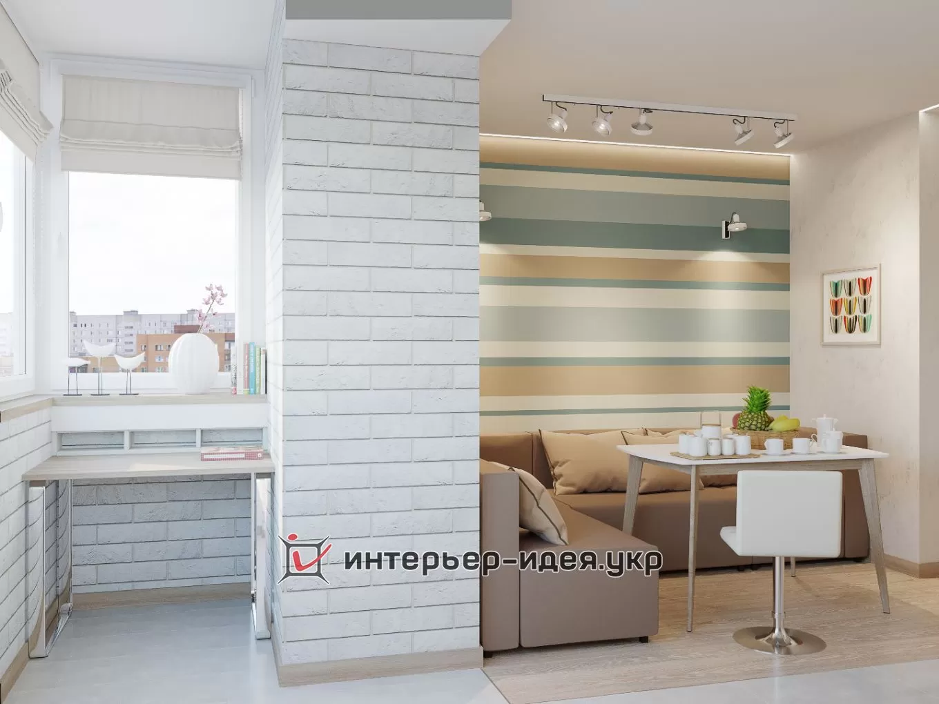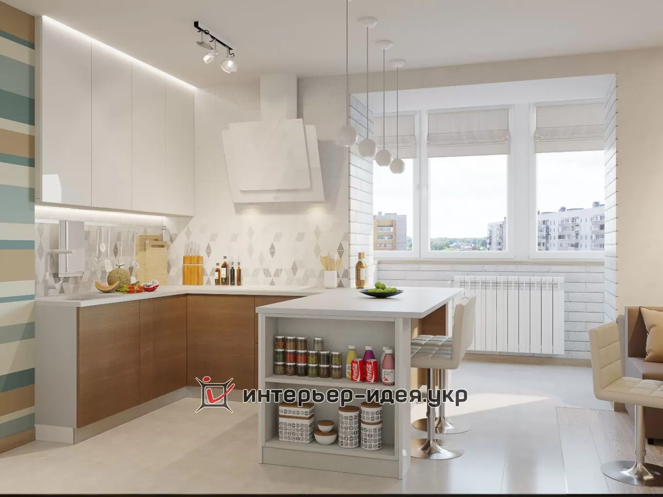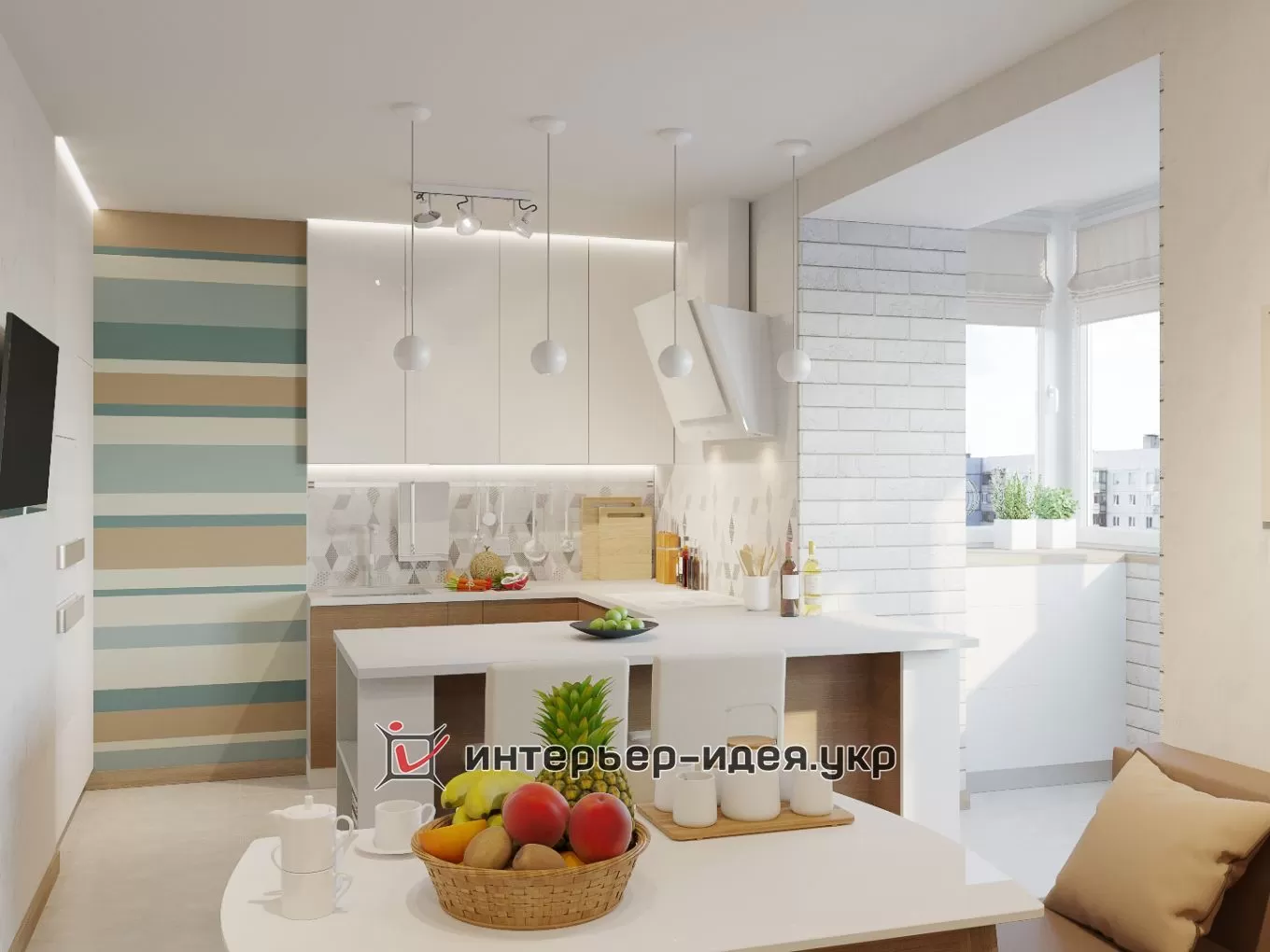 На тлі світлих стін і кухонних меблів рясніє смугаста обробка стін, сучасна ідея яка легко здійсненна при ремонті і буде відповіддю амбіційному виклику сучасного стилю.