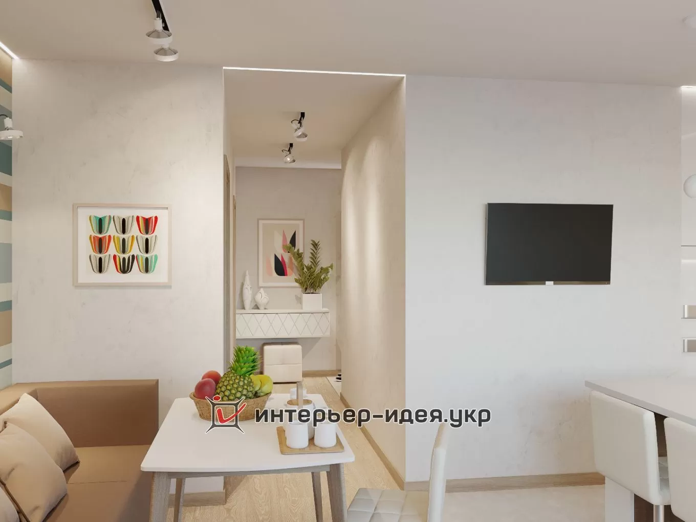 Спочатку передбачалося зробити кухню студію об'єднану з невеликою вітальнею. Ми вирішили, що буде доречним перетворити типову вітальню з зоною перегляду ТБ в їдальню, яка буде представляти єдине і більш просторий функціональний простір замість зонування приміщення. Теплі відтінки дерев'яних фактур добре поєднуються з білими кухонними фасадами, завдяки цьому кухонні меблі виглядають легко і повітряно як і передбачалося бажанням замовника.