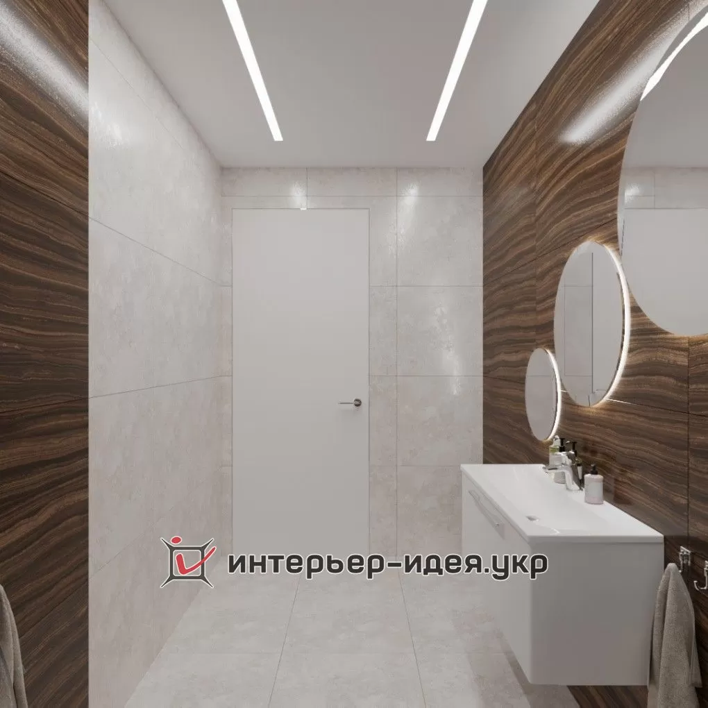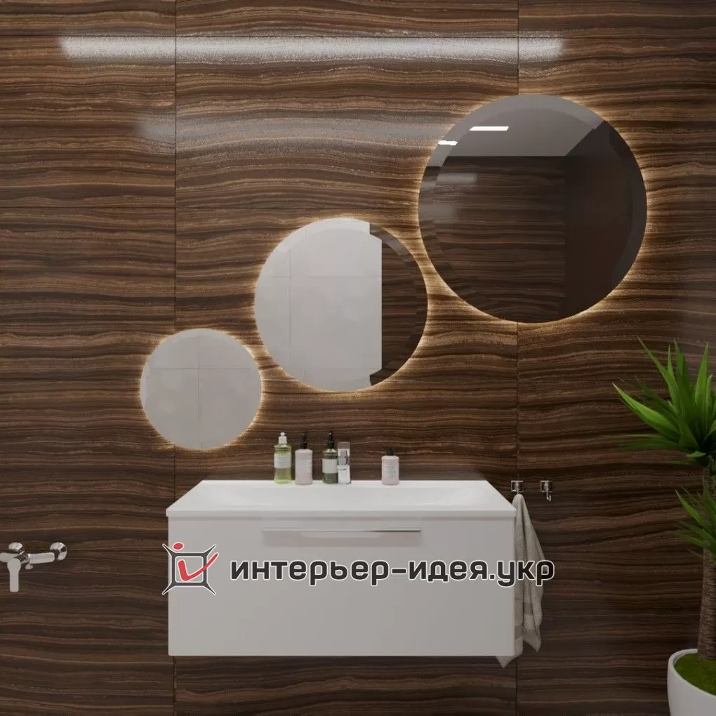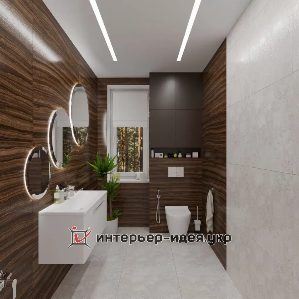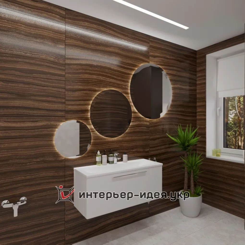 До того ж на тлі темної плитки більш виграшно виглядає біла сантехніка і дзеркала з підсвічуванням.