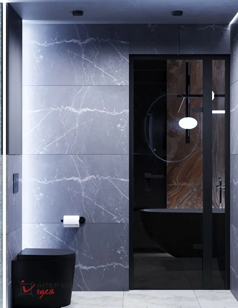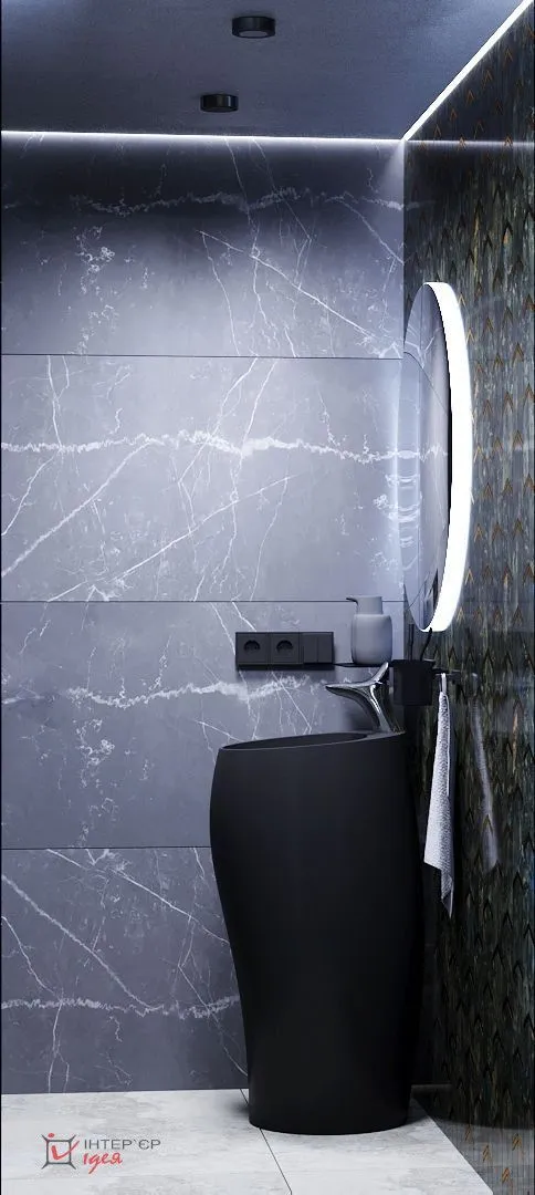 Сірий колір стелі (декоративна штукатурка) та елементи чорного кольору (полиця над умивальником, туалетні аксесуари, точкові світильники на стелі, тримач для рушника) вдало доповнюють інтер'єр.