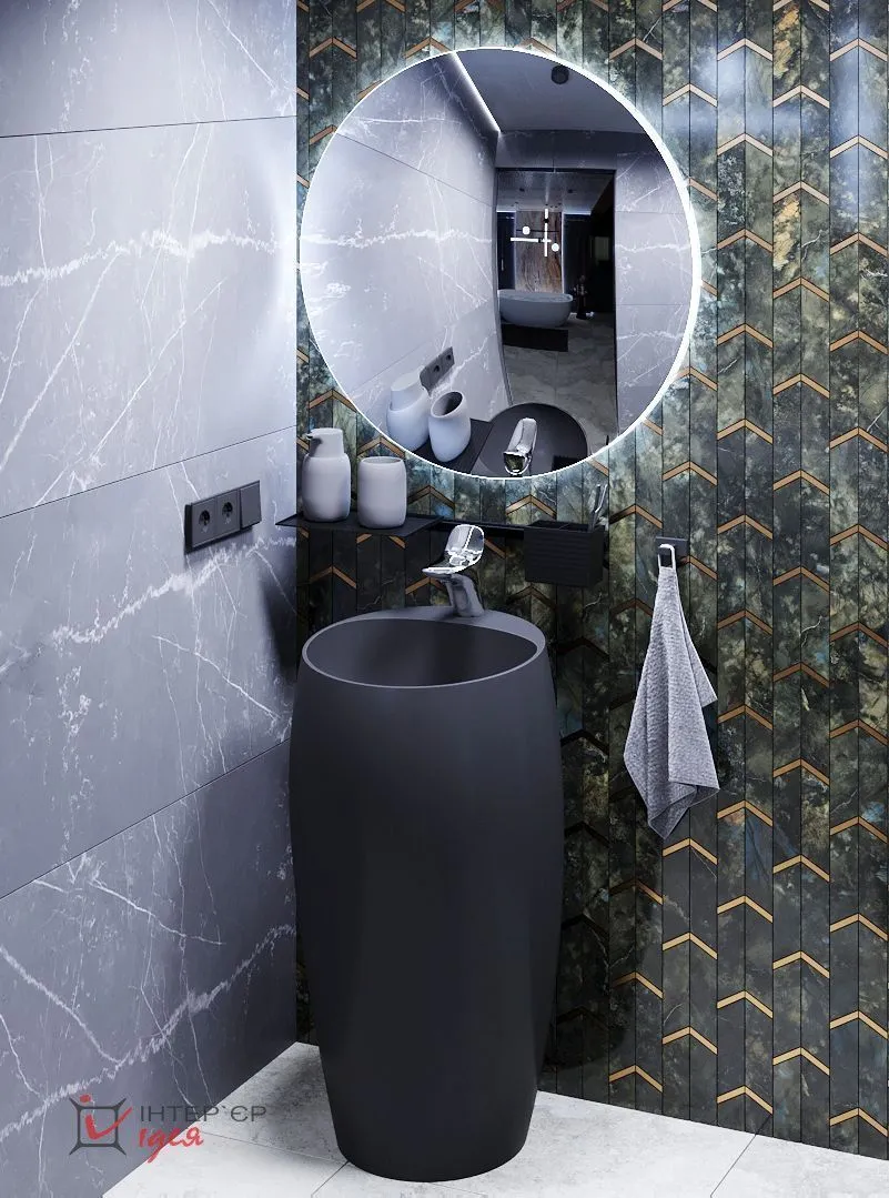 Неймовірно-красива плитка мозаїка зеленого кольору у формі шеврона прикрасила стіну, яку першою бачимо при вході в санвузол. Тут же розміщений стильний підлоговий округлий умивальник графітового кольору та кругле дзеркало з підсвіткою.