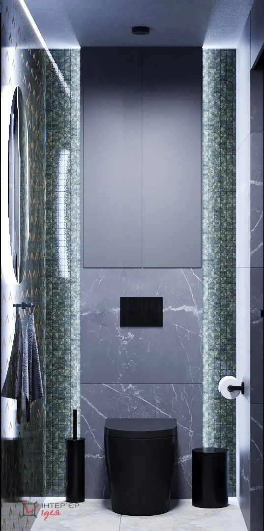 Унітаз підібраний під умивальник. Інсталяція для унітазу вмонтована у гіпсо-картонній конструкції, що декорована плиткою стриманого темно-сірого кольору (як і на решті стін). Вище – технічна шафа.