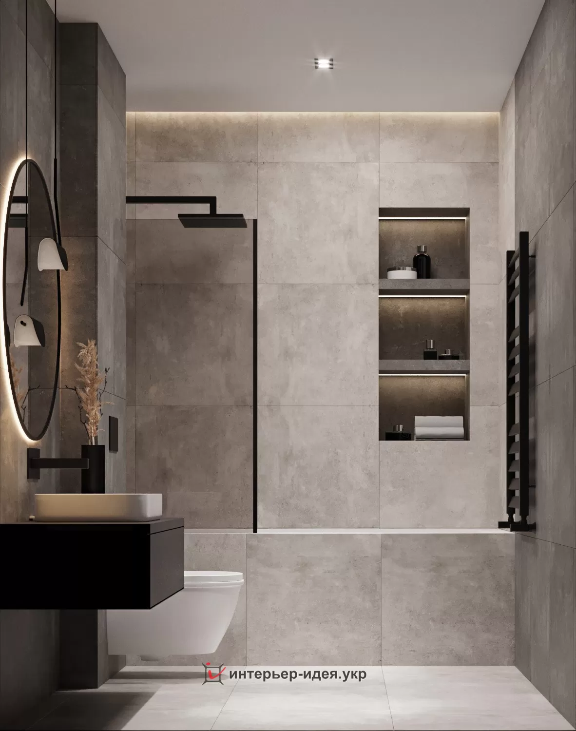 Мудро використали нішу в стіні під полиці з підсвіткою, що зроблені в один рівень зі стіною та обкладені плиткою.