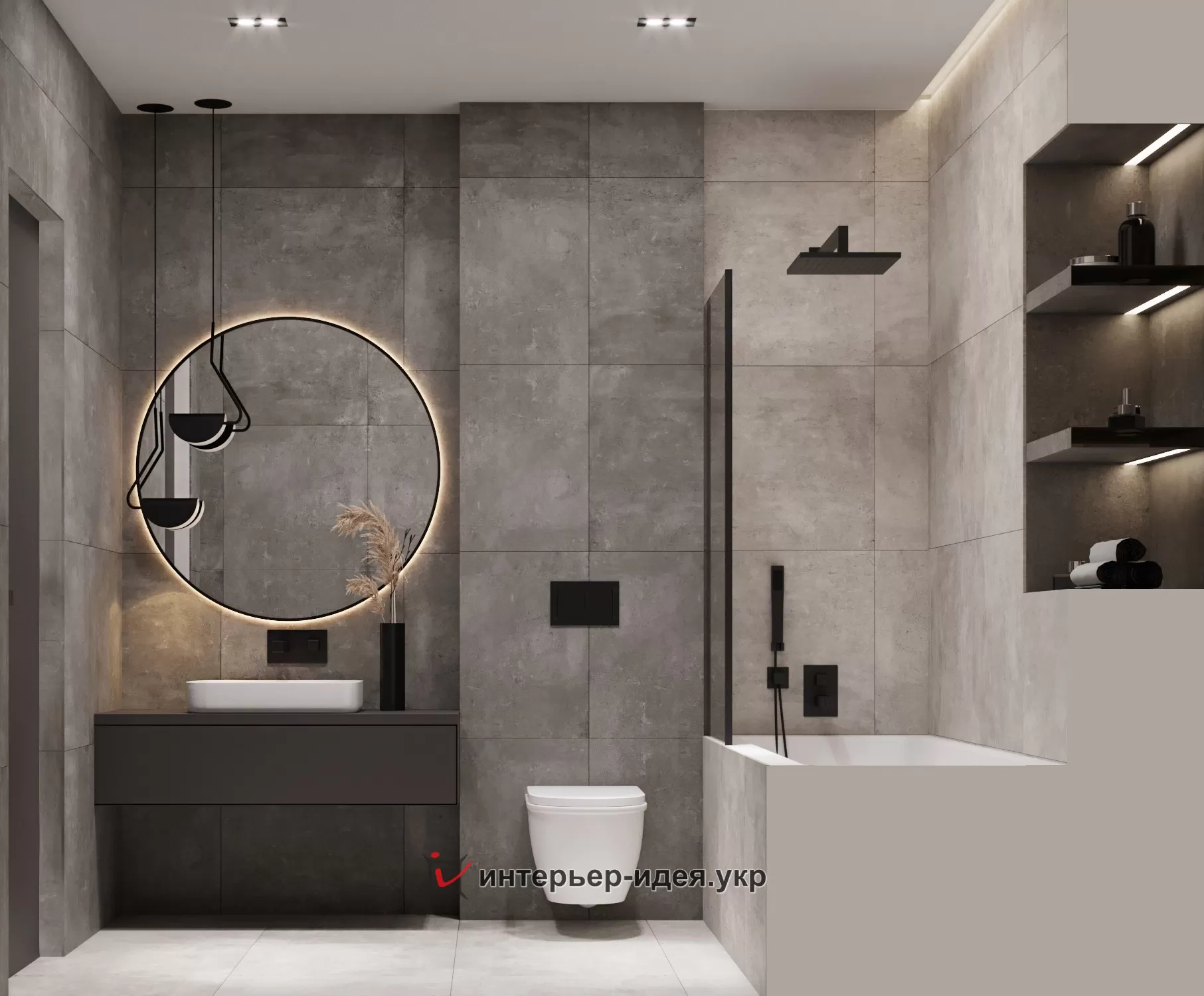 Основним завданням було створити сучасний простір для щоденного життя молодому чоловікові. В даному санвузлі ми вдало поєднали дві текстури керамогранітної плитки з імітацією під бетон.
