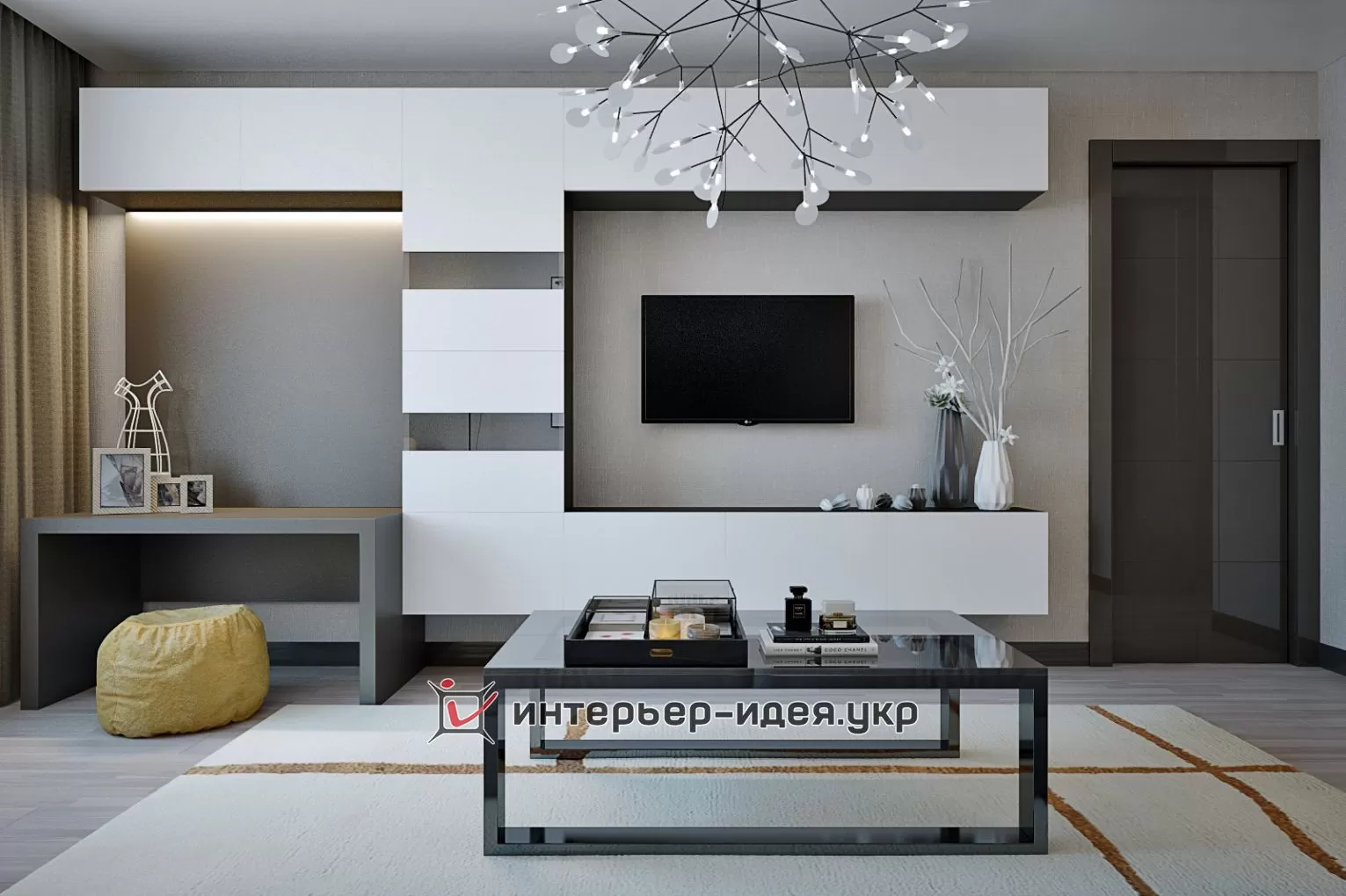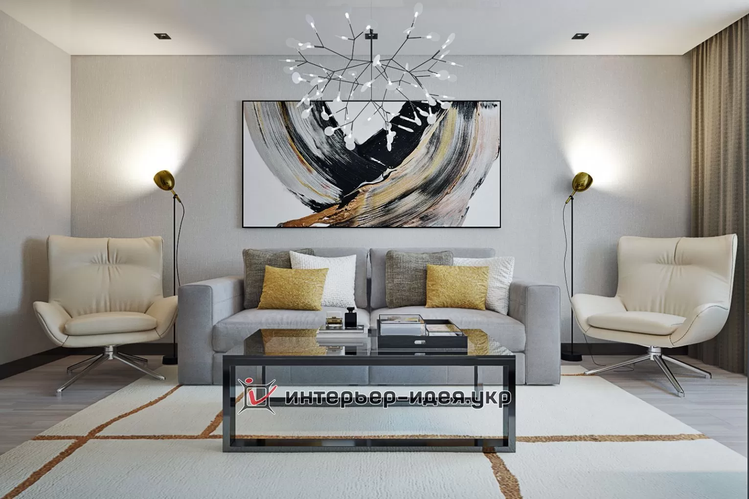 Дизайн вітальні в сірому кольорі з ніжно-лимонним акцентом, м. Черкаси