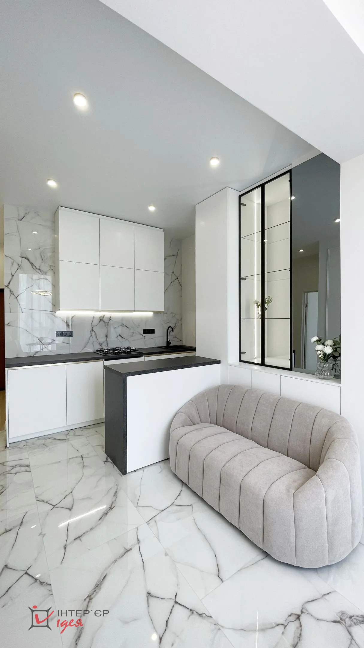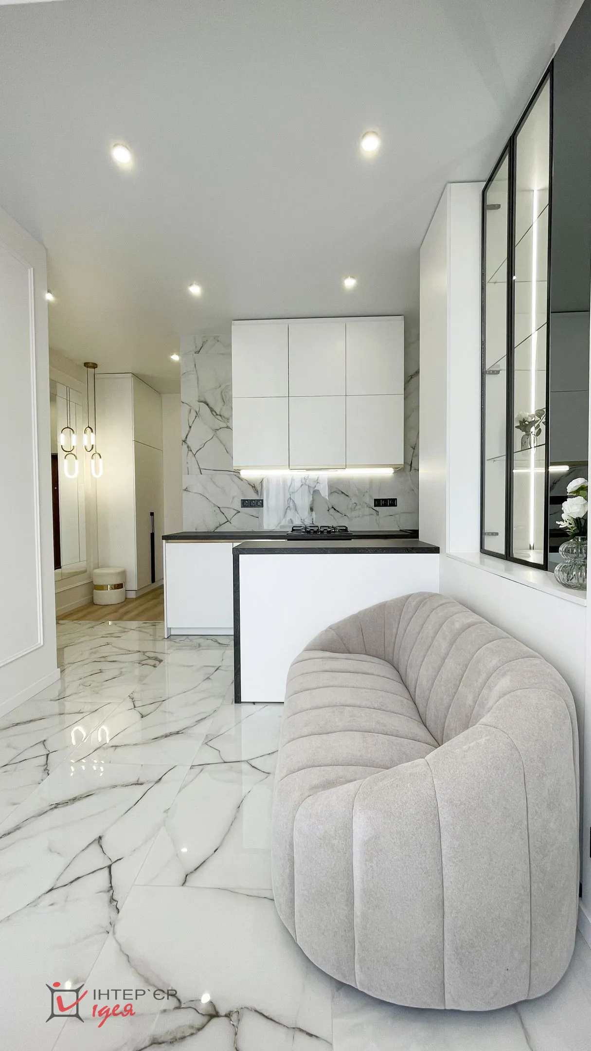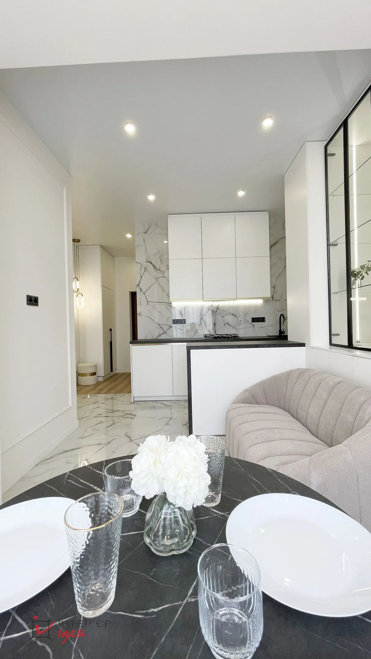 Інтер’єр виконано у світлих, спокійних тонах, що додають відчуття простору та легкості. Серед використаних матеріалів — тоноване скло, латунь, широкоформатна плитка, які надають проєкту елегантності та сучасності. Зоноване освітлення створює комфортну атмосферу у будь-який час доби, підкреслюючи текстури та деталі.