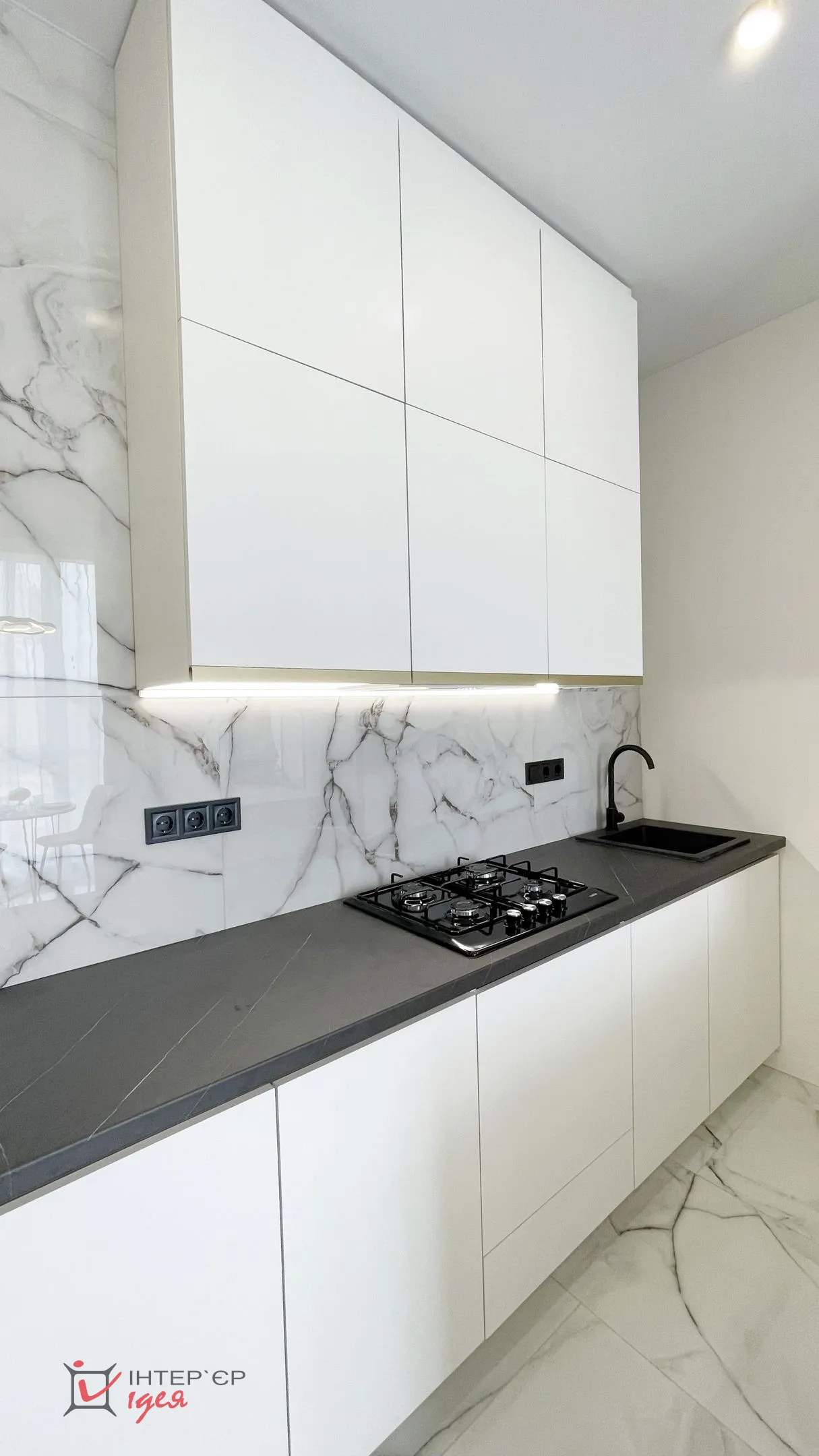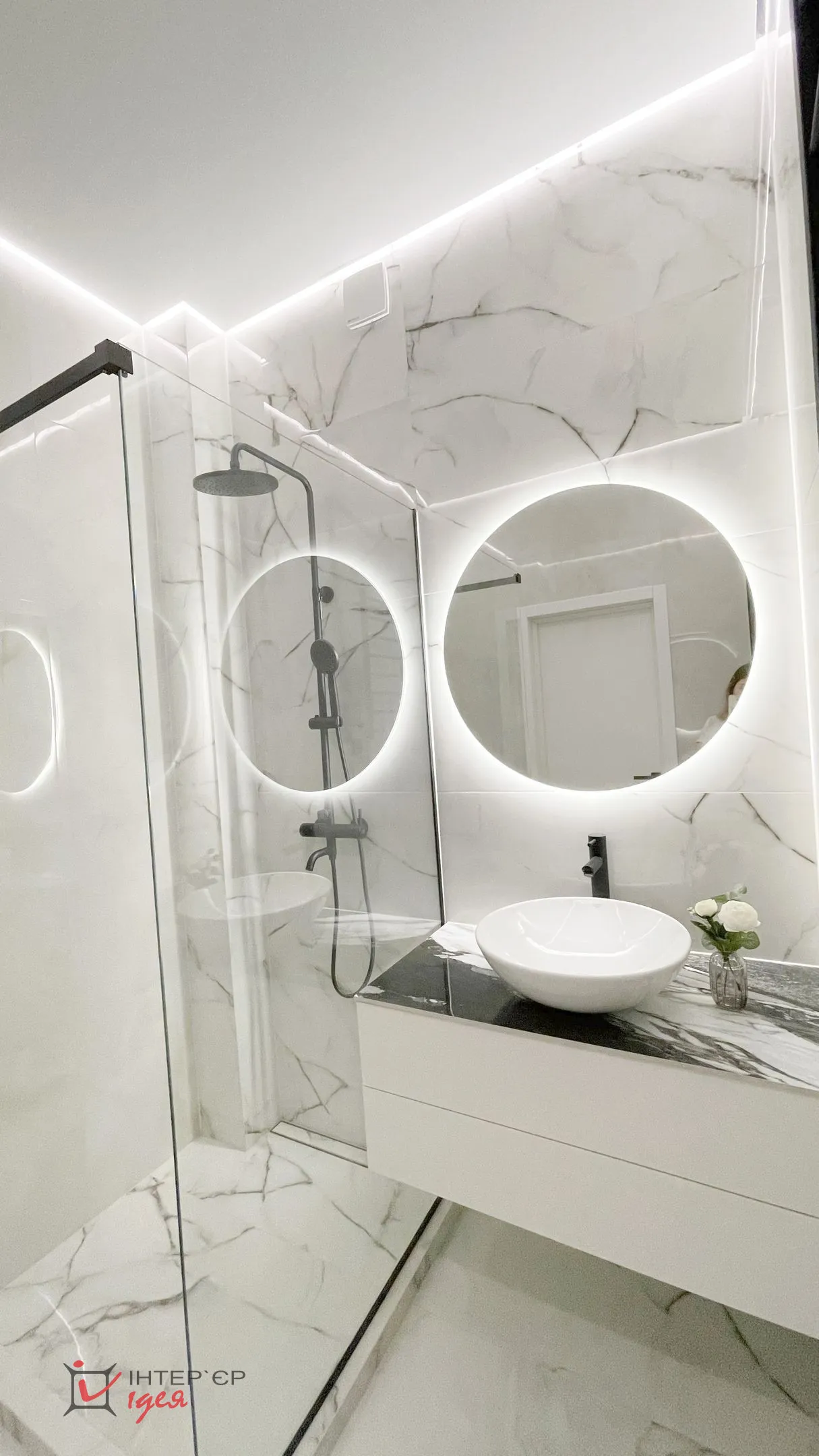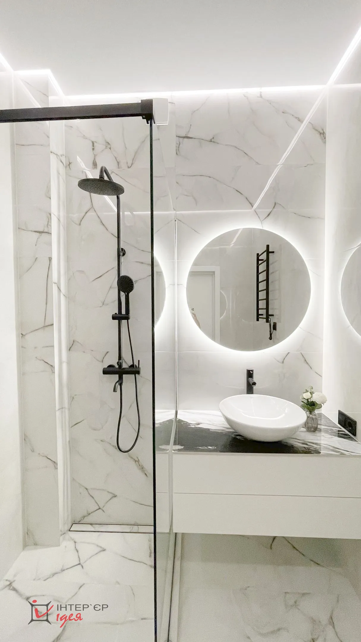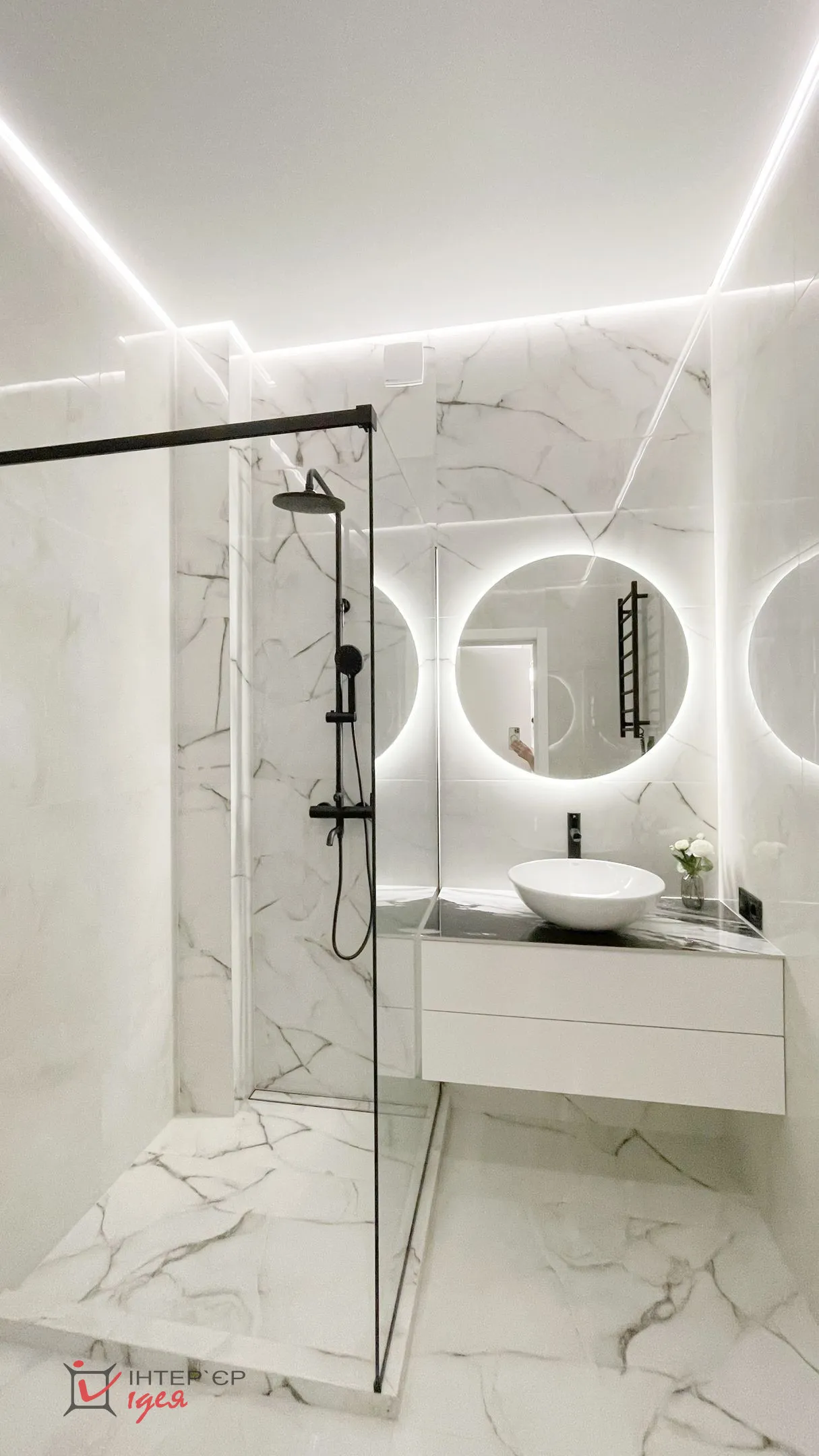 Інтер’єр виконано у світлих, спокійних тонах, що додають відчуття простору та легкості. Серед використаних матеріалів — тоноване скло, латунь, широкоформатна плитка, які надають проєкту елегантності та сучасності. Зоноване освітлення створює комфортну атмосферу у будь-який час доби, підкреслюючи текстури та деталі.